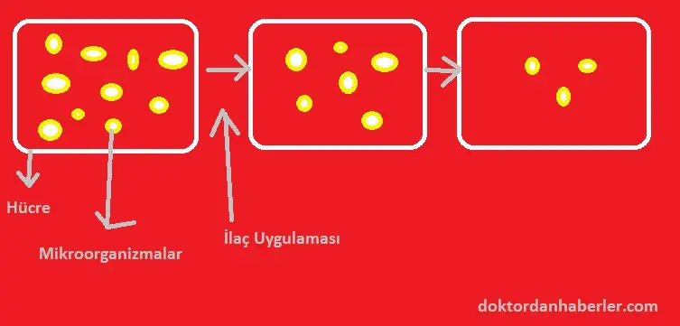 Şekildeki çizdiğim resimde içerisinde mikroorganizma bulunan hücreye ilaç uygulandıktan sonra mikroorganizmaların sayısının azalmasını görüyorsunuz. İlaç sayesinde mikroorganizmalar regresyona uğruyor.