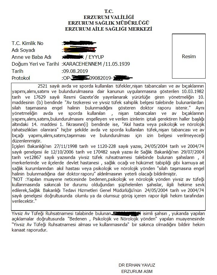 Aile hekimine her başvuran birey yivsiz tüfek ruhsatını alabilir diye bir durum söz konusu değildir. Bazı hastalar doğrudan aile hekimlerinden alabilirken bazı hastalar psikiyatri bölümünden almak durumunda kalabilirler.